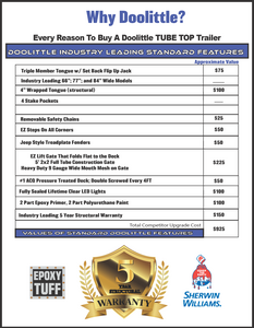 Each Doolittle trailer is prepped with a two-part Epoxy Primer, providing a strong foundation for the paint to adhere to. We then apply a two-part Polyurethane Paint finish, which has been proven to be more durable than traditional powder coat finishes. This combination of primer and paint not only enhances the appearance of your trailer but also provides superior protection against the elements, abrasion, and corrosion.